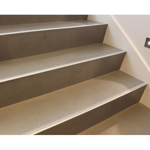 The safety stair nosing with 13 mm inserts look very elegant and are safe when installed in combination with LVT and wooden stairs, as well as epoxy resin flooring or microcement.