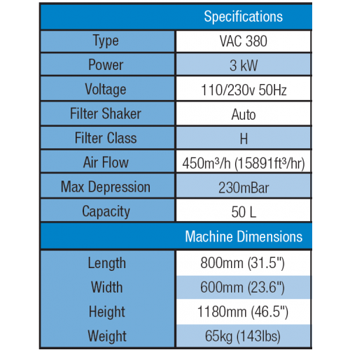 SPE VAC380 vacuum cleaner is suitable to safely operate in any environment or application where there are large quantities of dust to be removed, thanks to the use of 3 class H filters in series and the fully automatic cleaning system of the filter.