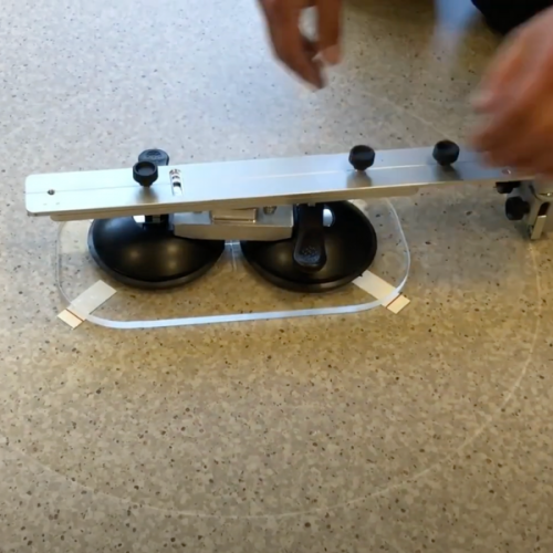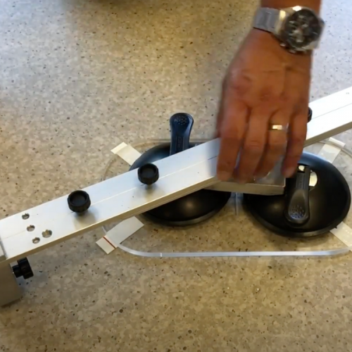 Plexiglass disc with adhesive strips, extension rails up to 130 cm radius, pencil,spare blades, carrying case.
